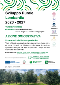Venerdì 13 marzo 2026, presso Ballabio Winery, via San Biagio 32 – 27045 Casteggio (PV), dalle ore 09:00, verrà effettuata una potatura di produzione in un oliveto già attivo da circa 25 anni, per illustrare e dimostrare quelle che sono le tecniche agronomiche ritenute migliori per agire su piante il cui scopo è quello di produrre efficacemente stagione dopo stagione.